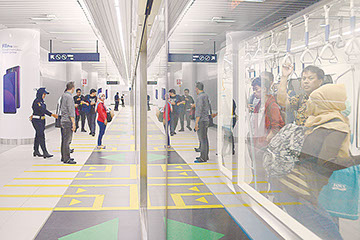 Seorang Pekerja berdiri di garis kuning yang merupakan garis antrean untuk menaiki MRT di Stasiun Bundaran HI, Jakarta, kemarin.