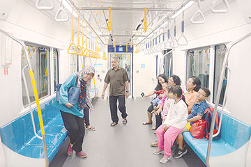 Penumpang saat berada di Ratangga-nama kereta MRT-yang hendak melaju dari Stasiun Bundaran HI, Jakarta, Senin (25/3)